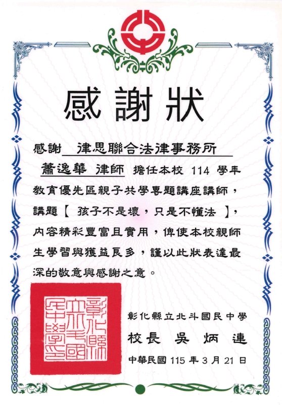 本所蕭律師取得教育部114年度「專科以上學校師對生霸凌事件專業調查人才庫培訓」研習結業證書,我們將為學校提供更完善法律服務,一起守護校園安全,預防校園霸凌!