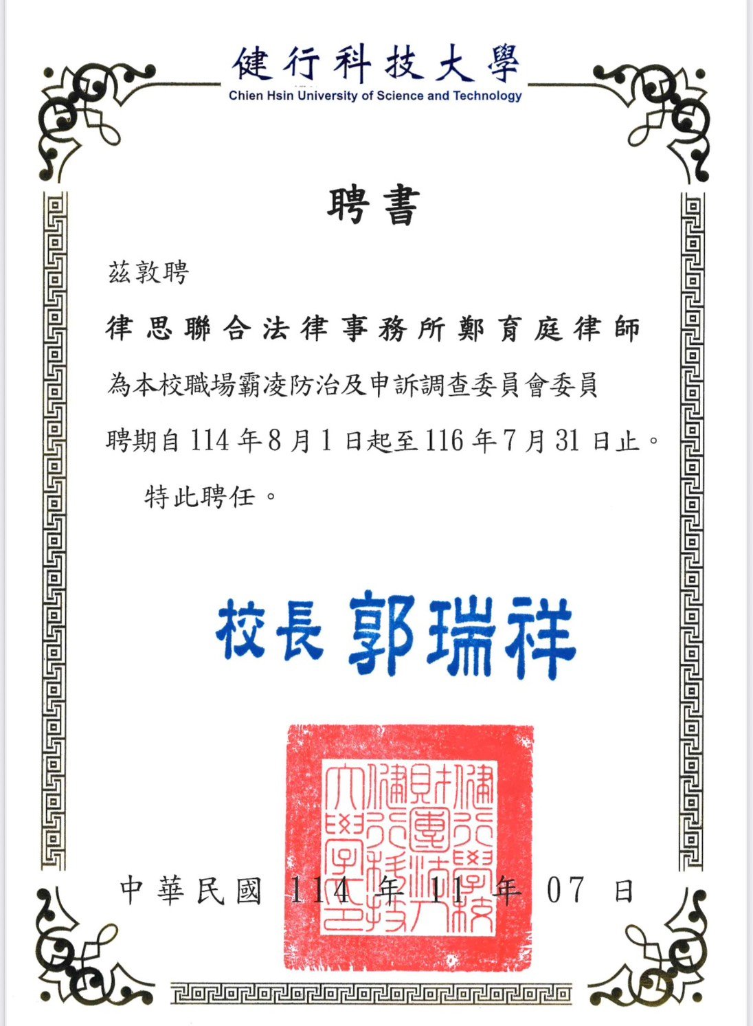 本所鄭律師於114年8月1日起至116年7月31日止擔任健行科技大學職場霸凌調查委員及申訴審議委員,感謝各校熱情邀約!