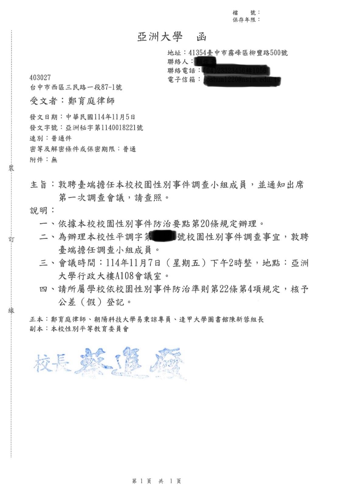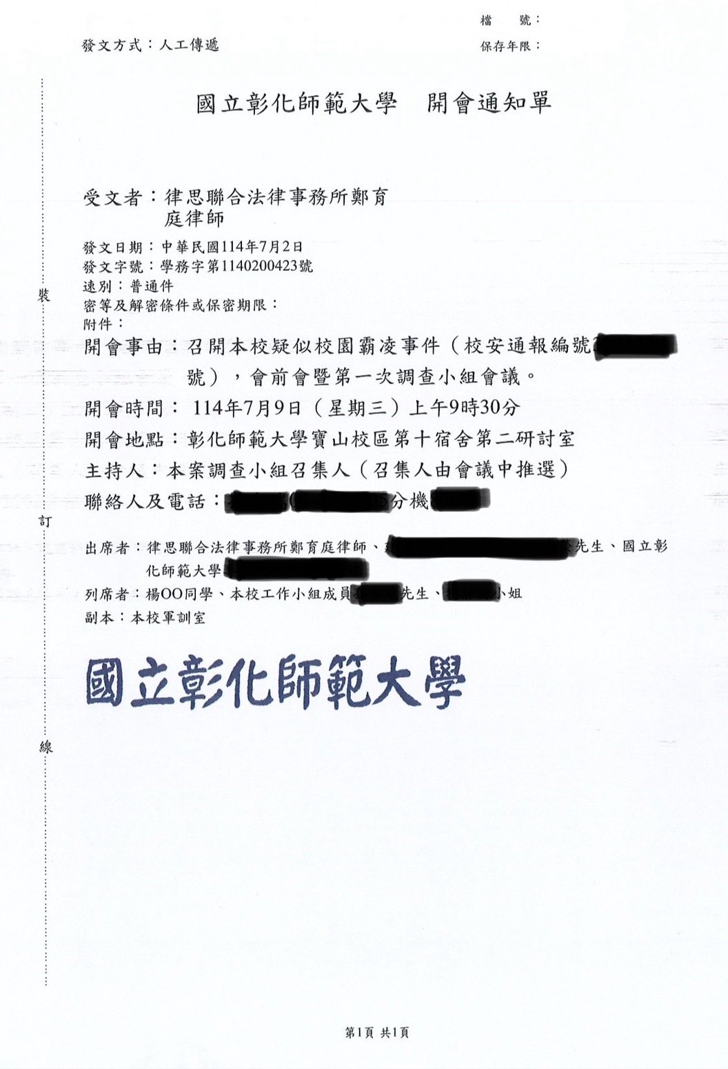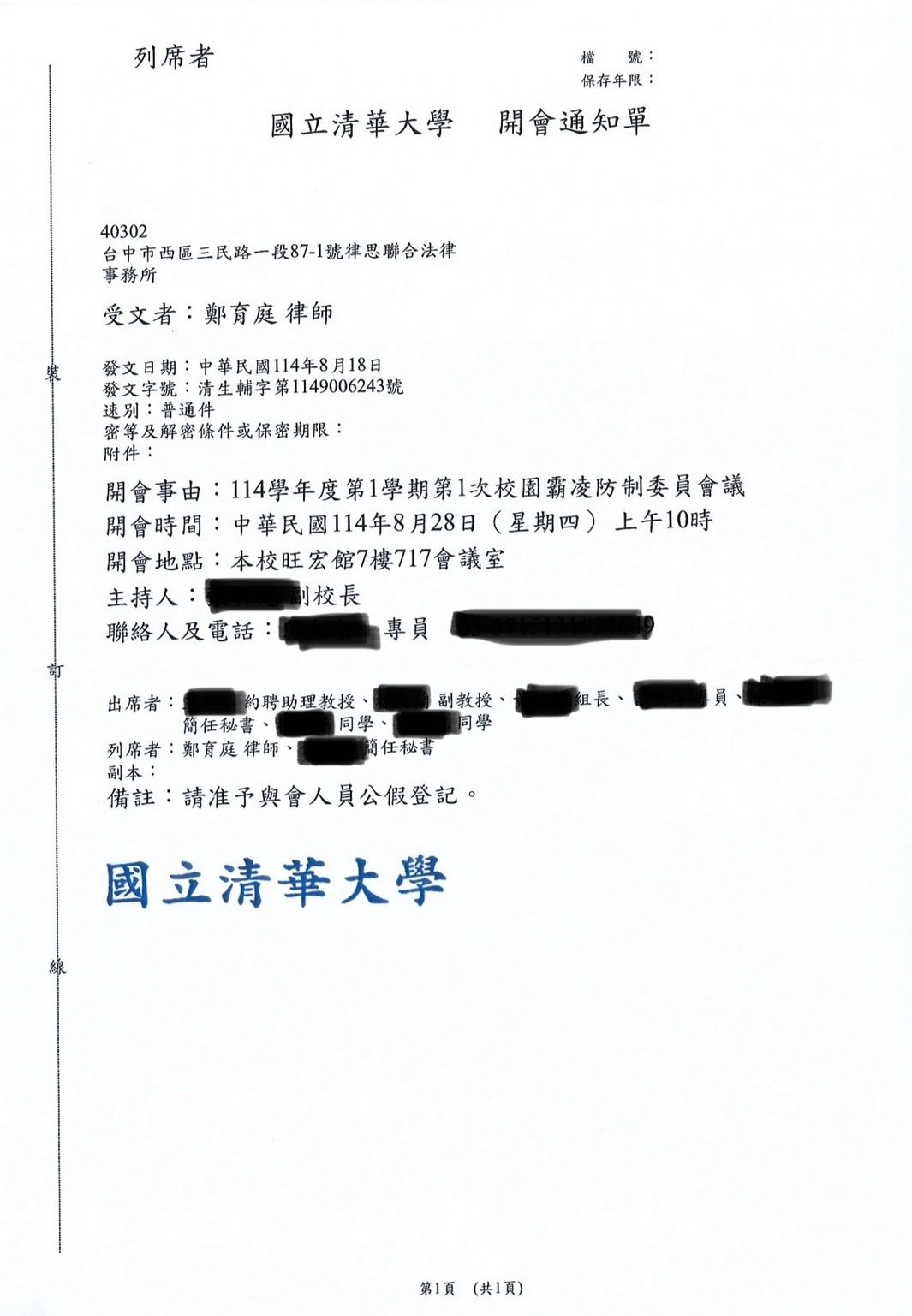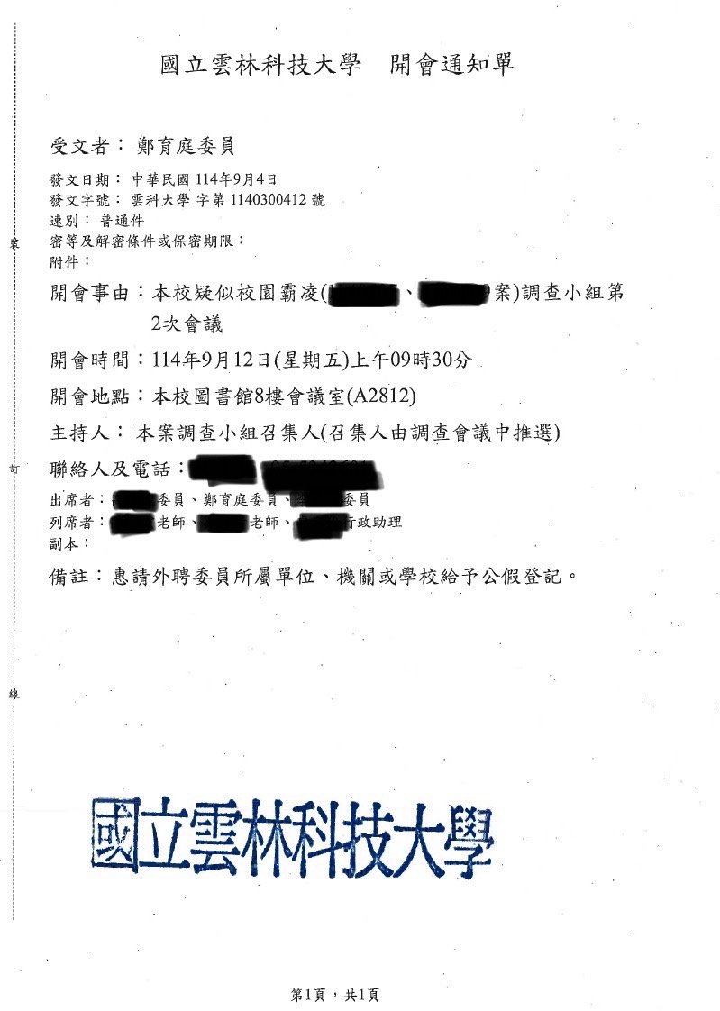 實績案例 Greenstone Law Firm 11.本所鄭律師於114年至各大專院校擔任校園性別事件、霸凌調查委員 今年各校的性別事件及霸凌案件數量較以往倍增,鄭律師奔波於各校參與調查,近期無法更新網頁文章,請各位見諒orz ! 謹提供學校的聘書或開會通知,特此證明鄭律師真的是沒有時間寫文章QQ 返回列表