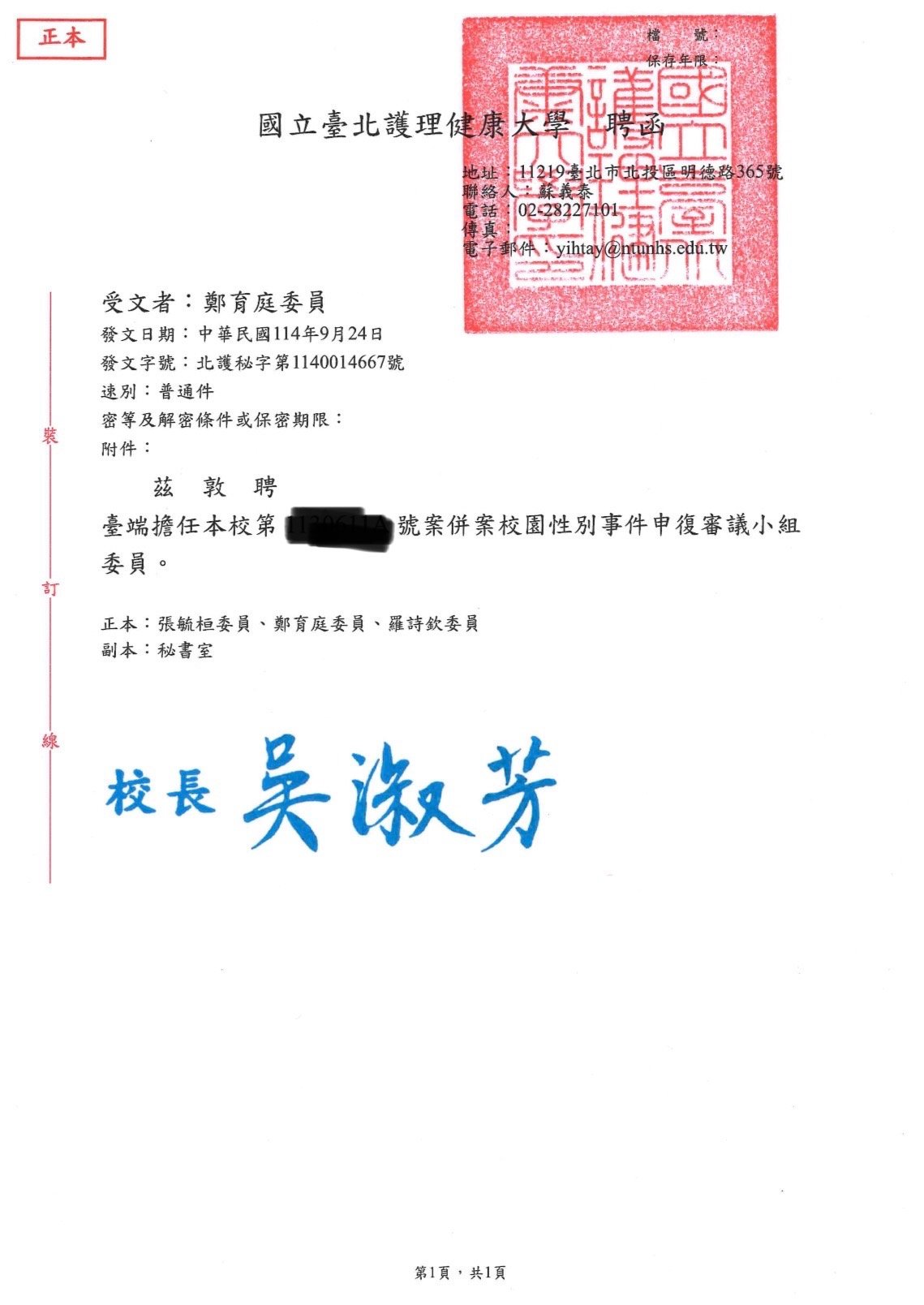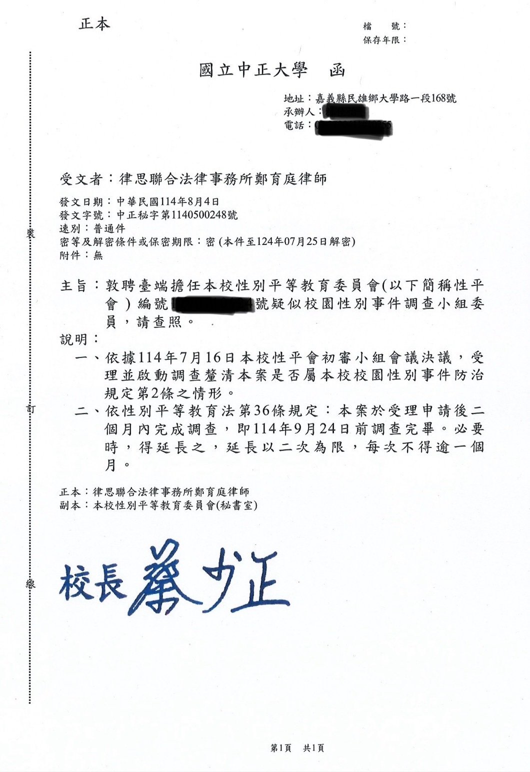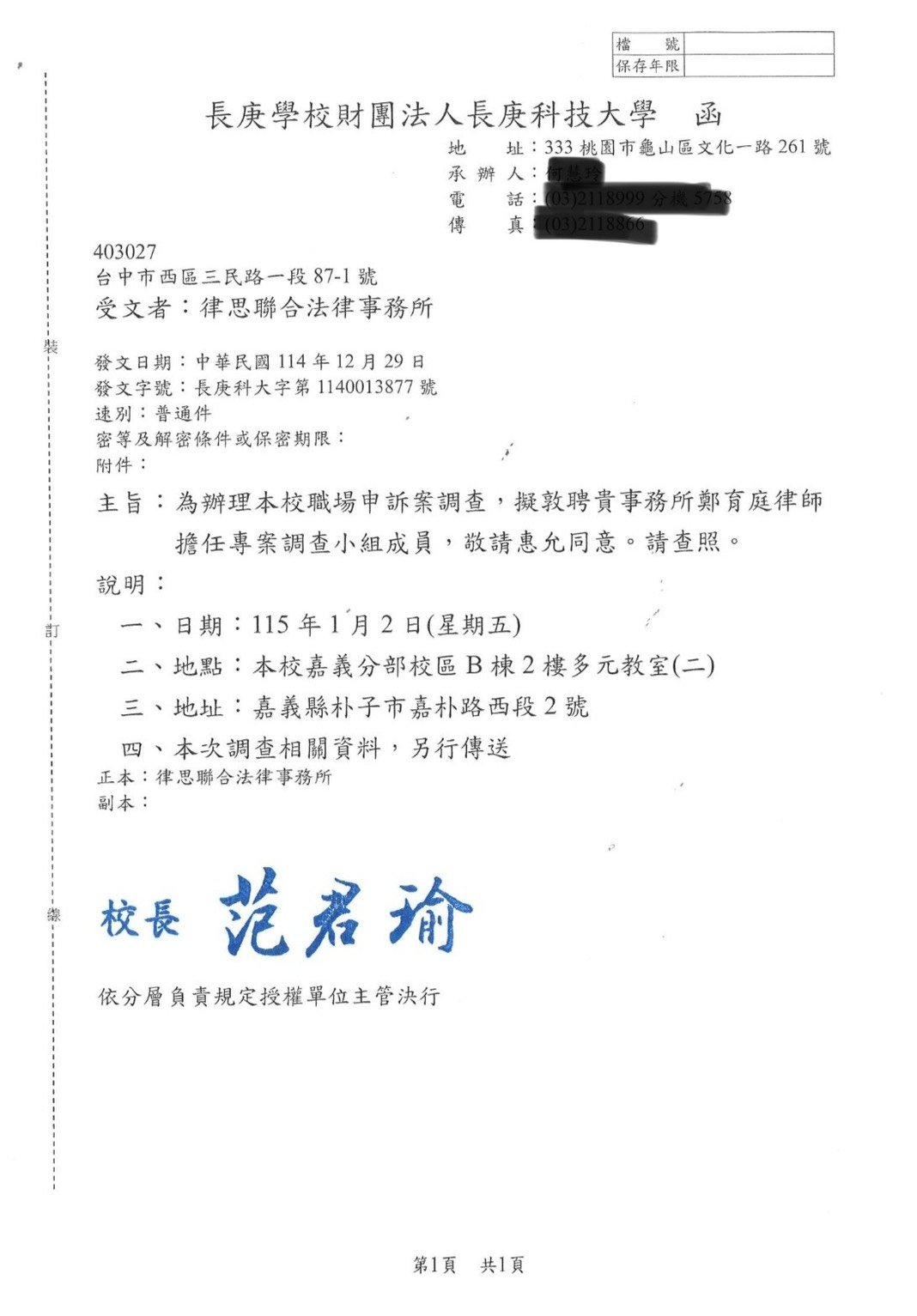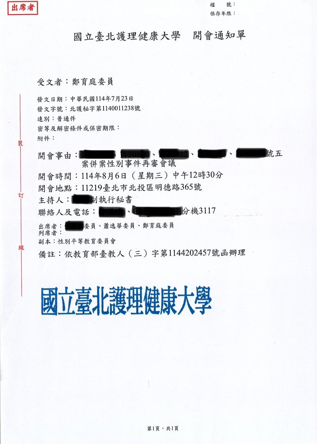 實績案例 Greenstone Law Firm 11.本所鄭律師於114年至各大專院校擔任校園性別事件、霸凌調查委員 今年各校的性別事件及霸凌案件數量較以往倍增,鄭律師奔波於各校參與調查,近期無法更新網頁文章,請各位見諒orz ! 謹提供學校的聘書或開會通知,特此證明鄭律師真的是沒有時間寫文章QQ 返回列表