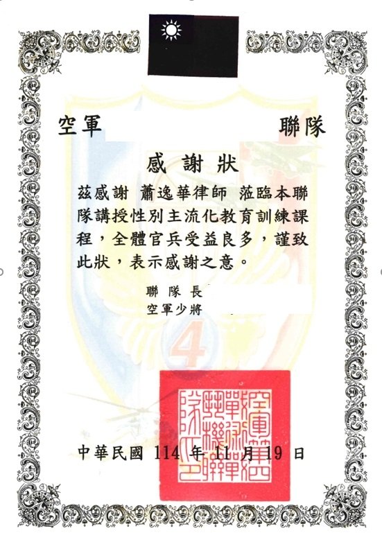 15.本所蕭律師於114年11月9日獲邀至空軍聯隊講授「性別主流化教育訓練課程」,提供國軍官兵最新的性平法法律知識。