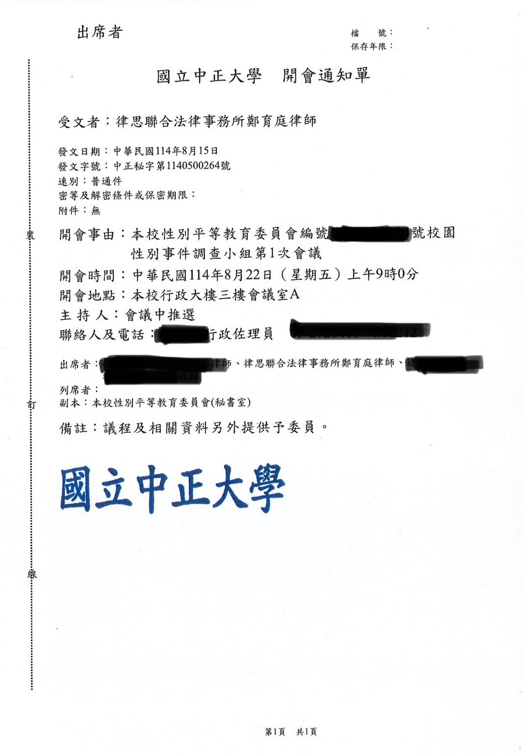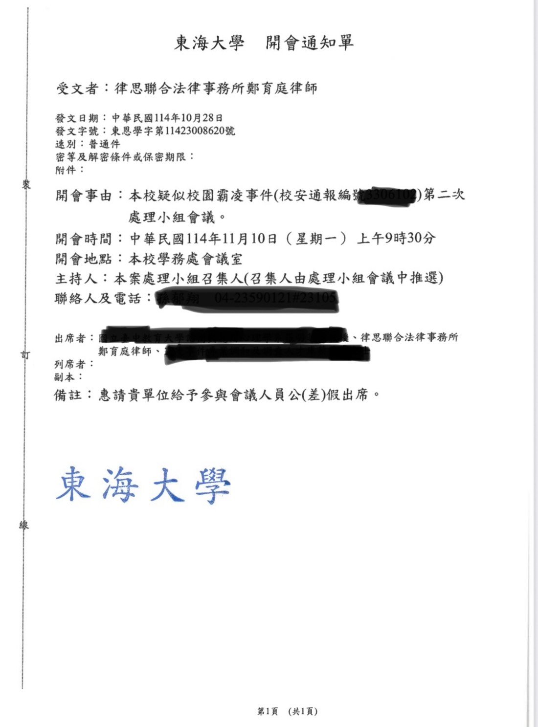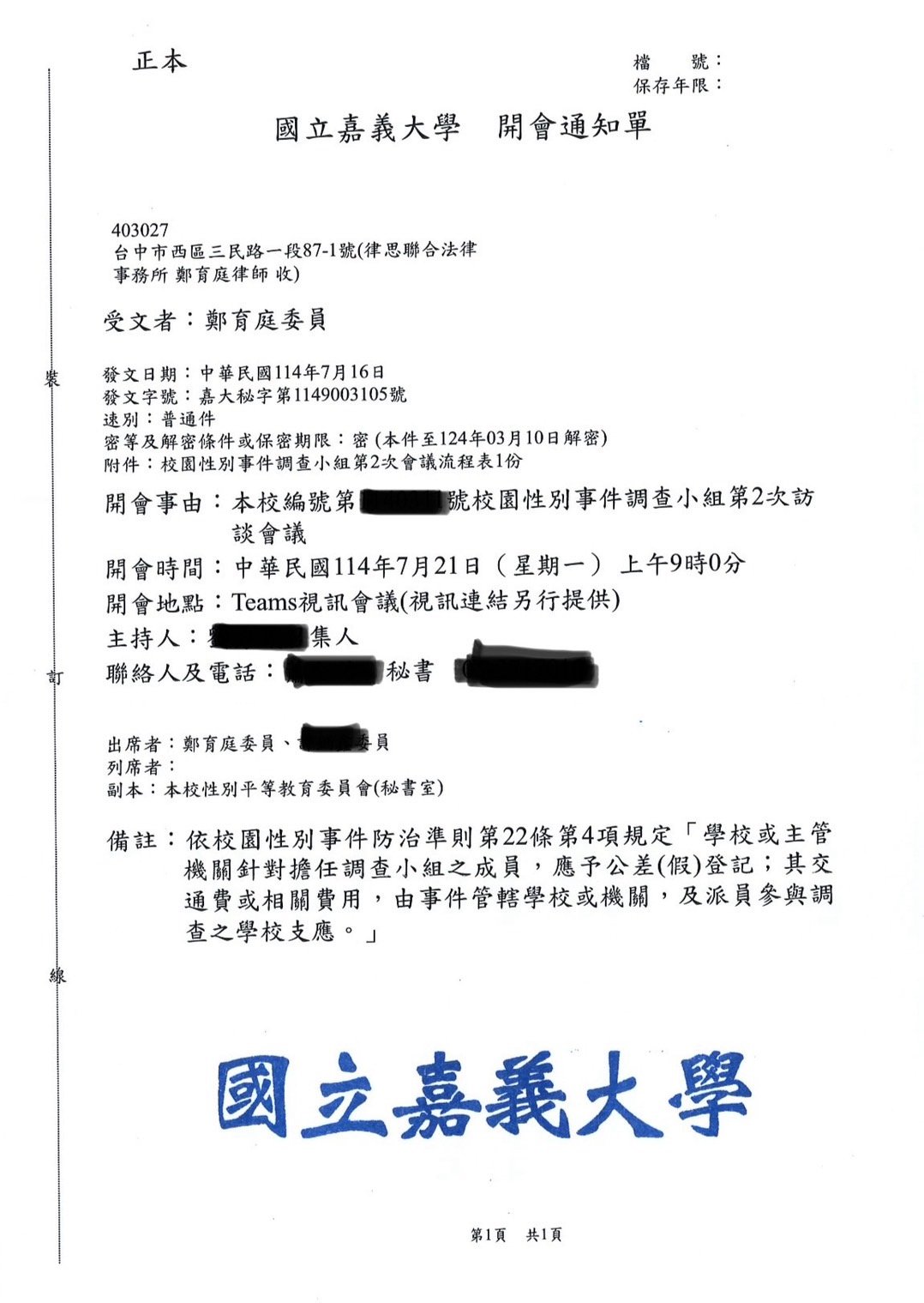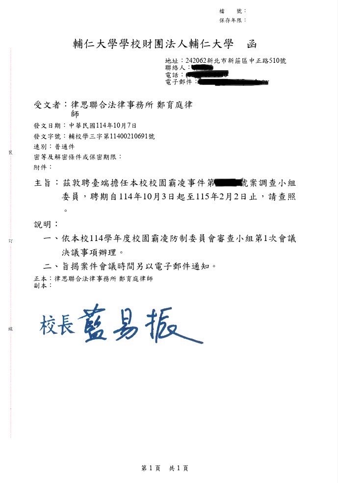 實績案例 Greenstone Law Firm 11.本所鄭律師於114年至各大專院校擔任校園性別事件、霸凌調查委員 今年各校的性別事件及霸凌案件數量較以往倍增,鄭律師奔波於各校參與調查,近期無法更新網頁文章,請各位見諒orz ! 謹提供學校的聘書或開會通知,特此證明鄭律師真的是沒有時間寫文章QQ 返回列表