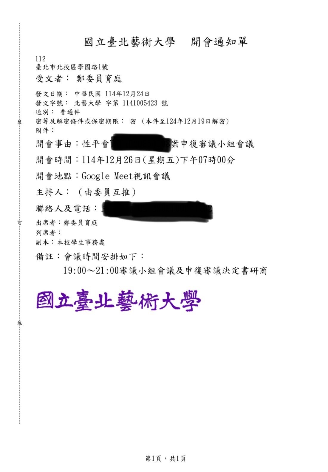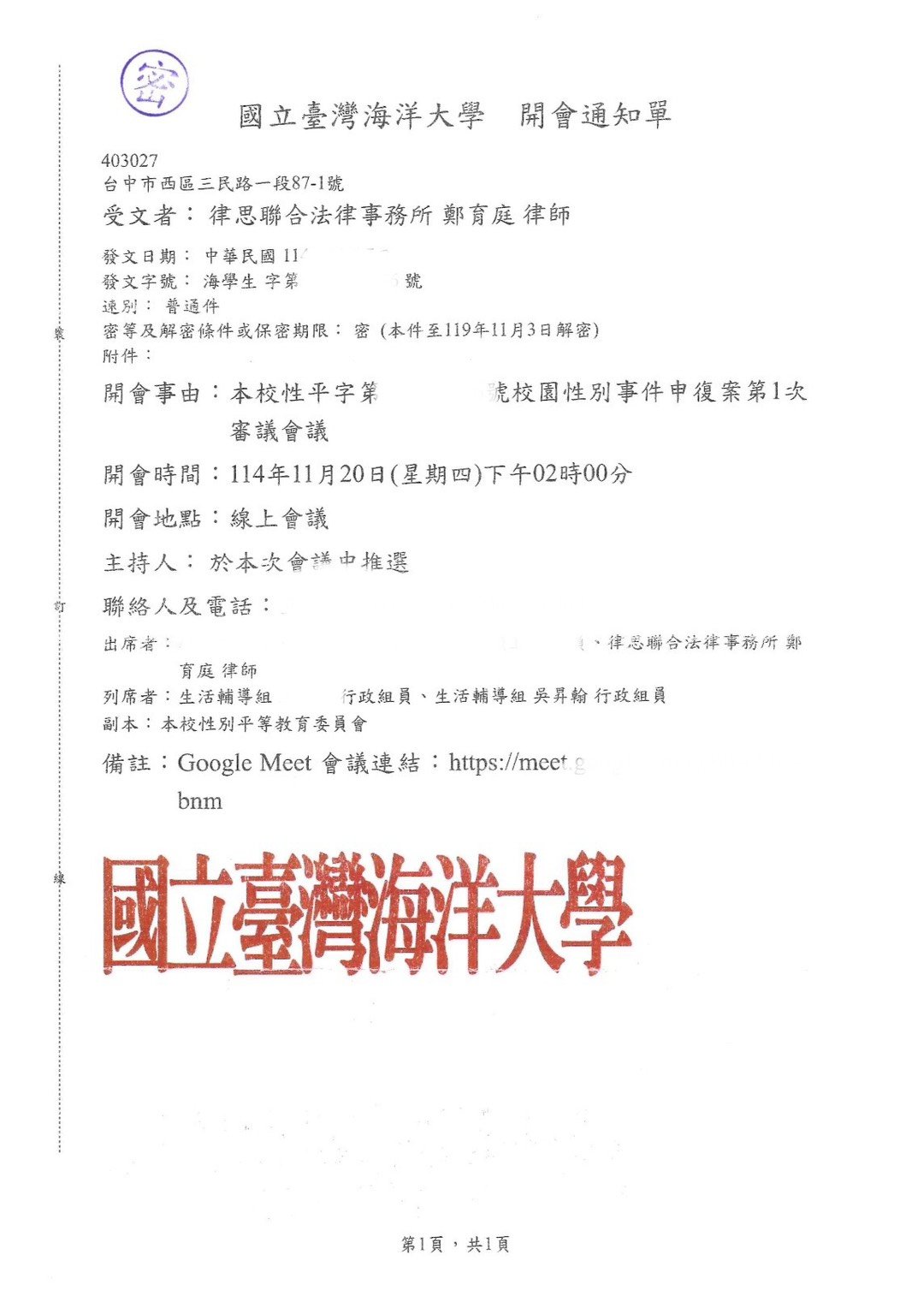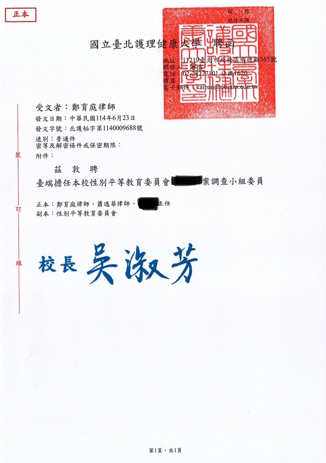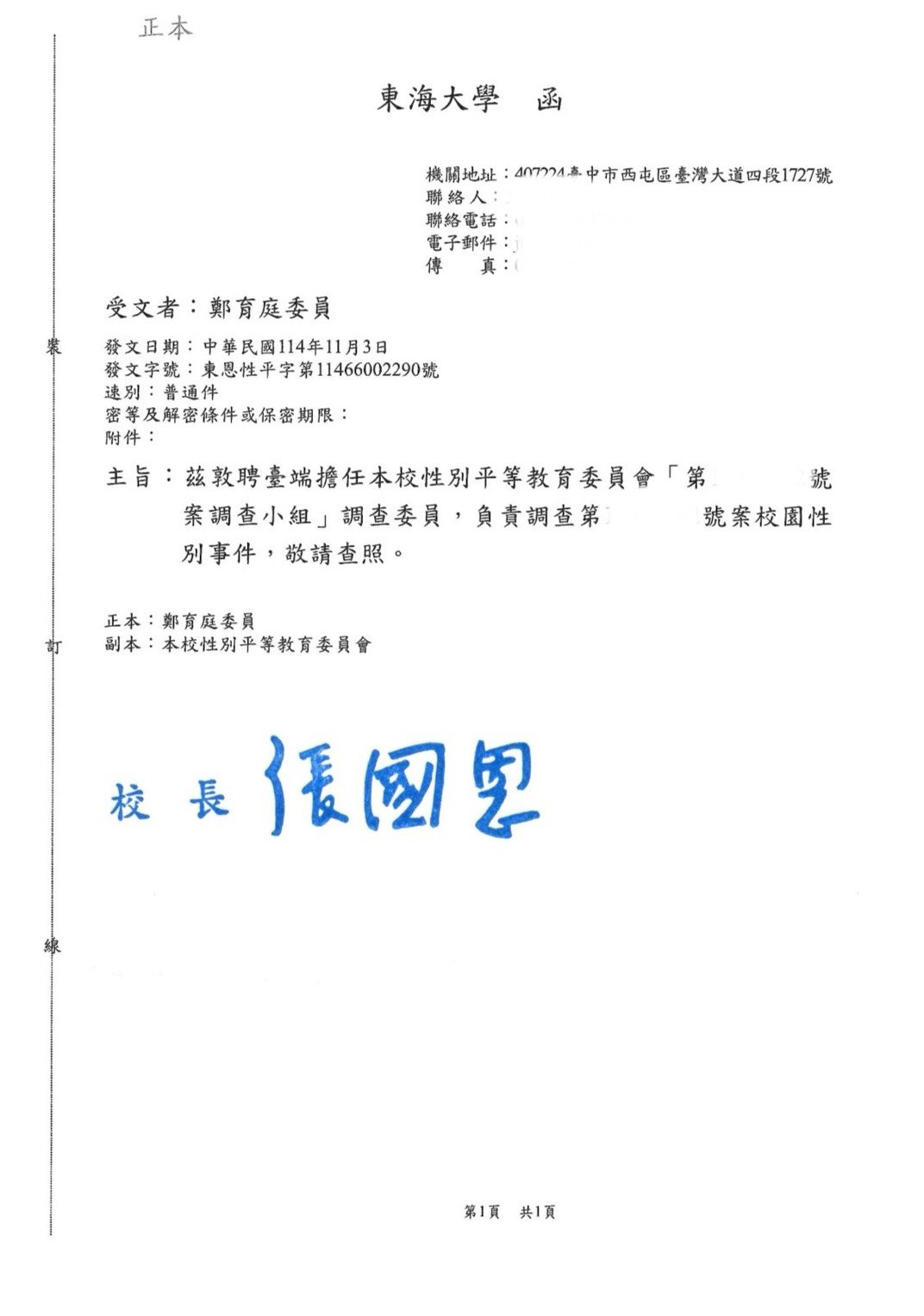 實績案例 Greenstone Law Firm 11.本所鄭律師於114年至各大專院校擔任校園性別事件、霸凌調查委員 今年各校的性別事件及霸凌案件數量較以往倍增,鄭律師奔波於各校參與調查,近期無法更新網頁文章,請各位見諒orz ! 謹提供學校的聘書或開會通知,特此證明鄭律師真的是沒有時間寫文章QQ 返回列表