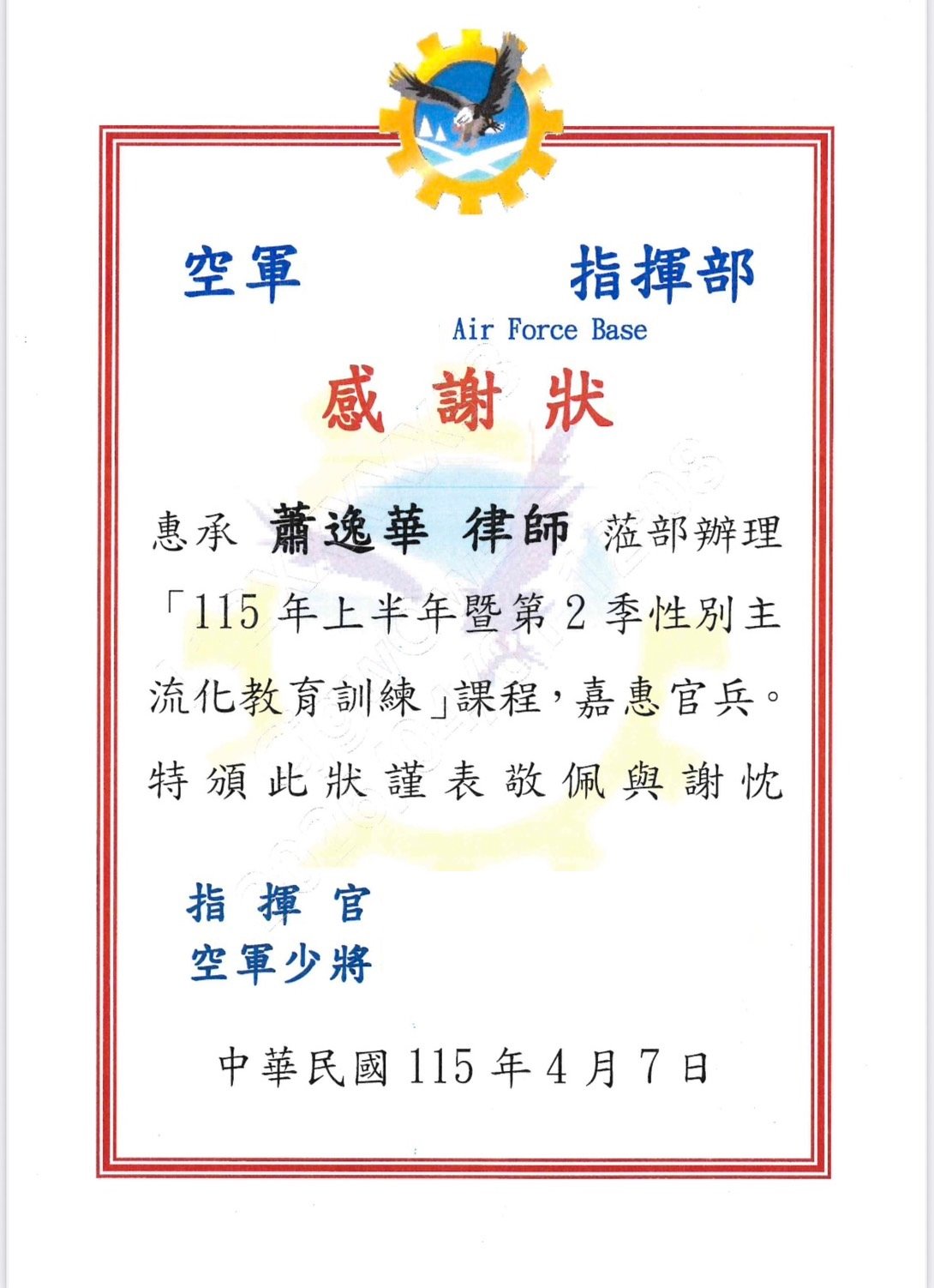 實績案例 Greenstone Law Firm 22.本所蕭律師於115年4月7日獲邀至空軍指揮部講授「性別主流化教育訓練課程」,提供國軍官兵最新的性平法法律知識。 本所蕭律師於115年4月7日獲邀至空軍指揮部講授「性別主流化教育訓練課程」,提供國軍官兵最新的性平法法律知識。 返回列表